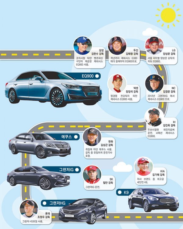 김한수 삼성 감독은 코치시절 벤츠가 애마였지만 지난시즌 종료 후 사령탑에 오른 뒤 구단이 제공하는 제네시스 EQ900 신차를 몰고 있다. 에쿠스의 후속 브랜드인 제네시스 EQ900은 1억1000만원 상당의 대형 세단으로, 국내 승용차 중 최고급 차종으로 꼽힌다. KBO리그 감독 중 상당수가 지난해 출시된 제네시스 EQ900으로 차가 바뀌었다.