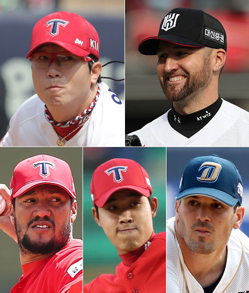 KIA 양현종(방어율 1.52)-kt 피어밴드(방어율 1.67)-NC 맨쉽(방어율 1.69)-KIA 임기영(방어율 1.99)-KIA 헥터(방어율 1.99). (왼쪽 상단부터 시계방향으로). 사진제공|스포츠코리아
