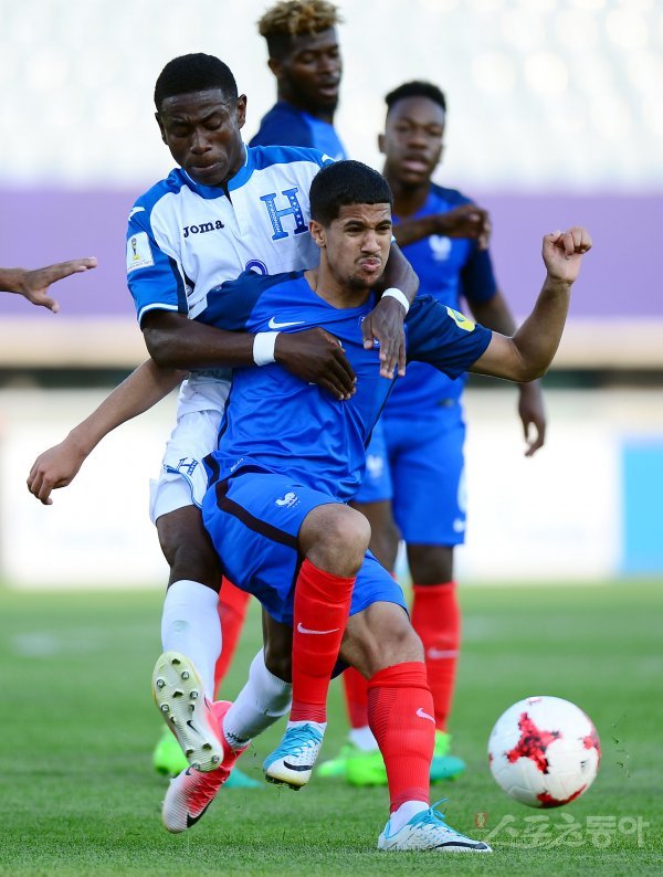 22일 천안종합운동장에서 ‘2017 FIFA U-20 월드컵’ 프랑스와 온두라스의 E조 예선 경기가 열렸다. 프랑스 뤼도빅 블라스(12)가 온두라스 밀착 수비에 고전하고 있다.