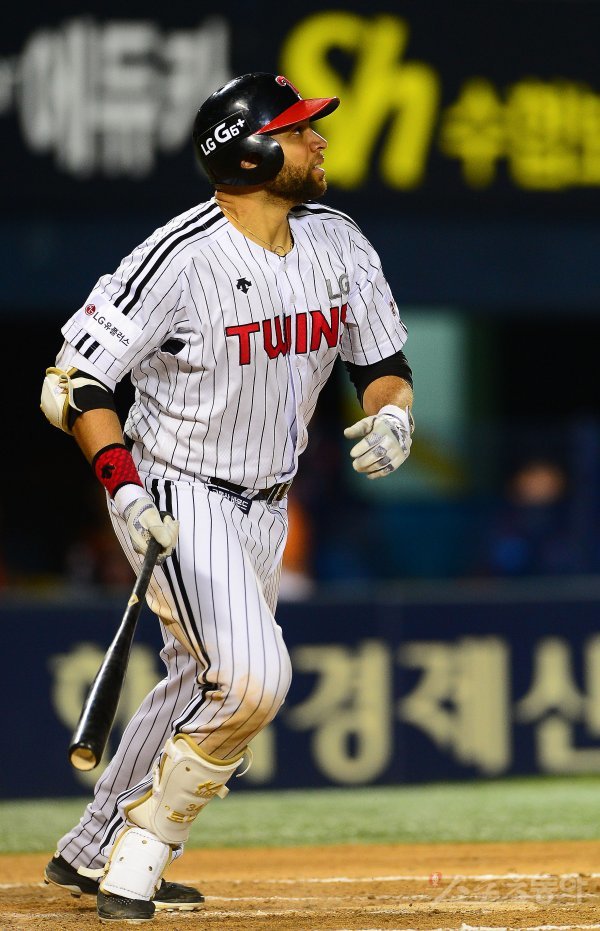 3일 서울 잠실야구장에서 ‘2017 타이어뱅크 KBO리그’ LG트윈스와 롯데자이언츠의 경기가 열렸다. 7회말 1사 LG 제임스 로니가 롯데 장시환을 상대로 솔로홈런을 치고 타구를 응시하고 있다.