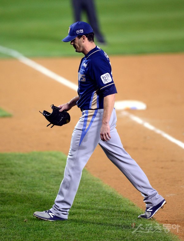 NC 제프 맨쉽이 18일 잠실구장에서 열린 플레이오프 2차전에서 6회말 두산 최주환에게 만루홈런을 맞은 뒤 강판되고 있다. 1차전 승리투수였던 맨쉽은 2차전에서 0.1이닝 3실점의 최악투로 패전투수가 됐다. 잠실 | 김종원 기자 won@donga.com