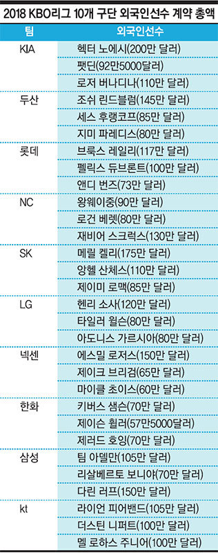 2018시즌 10개 구단 외국인선수 중 몸값이 가장 높은 이는 200만 달러를 받는 헥터 노에시(KIA)다. 메릴 켈리(SK·175만 달러), 에스밀 로저스(넥센)와 다린 러프(삼성·이상 150만 달러)가 뒤를 따른다.