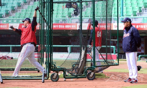 25일 인천 SK행복드림구장에서 ‘2018 신한은행 마이카 KBO리그’ SK 와이번스와 롯데 자이언츠의 경기가 열린다. 경기 전 롯데 조원우 감독이 이대호의 타격훈련을 바라보고 있다. 인천 | 김민성 기자 marineboy@donga.com