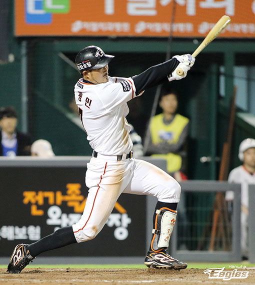 한화 송광민은 16일 현재, 2018 KBO리그의 유일한 4할 타자다. 연일 뜨거운 방망이로 독수리 군단의 비상을 이끄는 중이다. 초구 스윙을 두려워하지 않는 적극적인 자세로 전형적인 ‘쳐서 나가는 타자’의 모습을 자랑하고 있다. 사진제공|한화 이글스