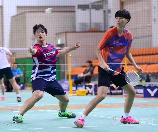 고등부 혼합복식 16강에서 이동찬(왼쪽)-강혜민 조가 리턴을 시도하고 있다.