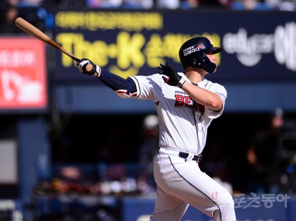 5회말 무사 1,2루 두산 김재환이 우중월 스리런홈런을 날리고 있다.