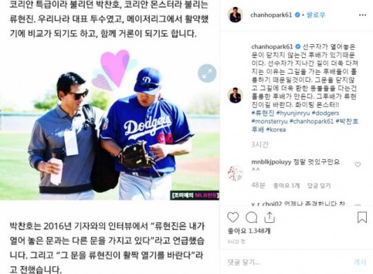 박찬호는 26일 자신의 인스타그램에 류현진과 찍은 사진을 게재한 뒤 “선구자가 열어놓은 문이 닫히지 않는 건 후배가 있기 때문이다”고 언급했다.
