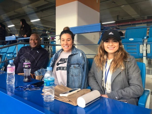 약 2주간의 짧은 일정에도 아들의 경기를 모두 지켜보며 응원하는 멜 로하스 시니어(왼쪽부터)와 로하스 주니어의 아내, 윌리엄 쿠에바스의 약혼자. 사진제공 | KT 위즈