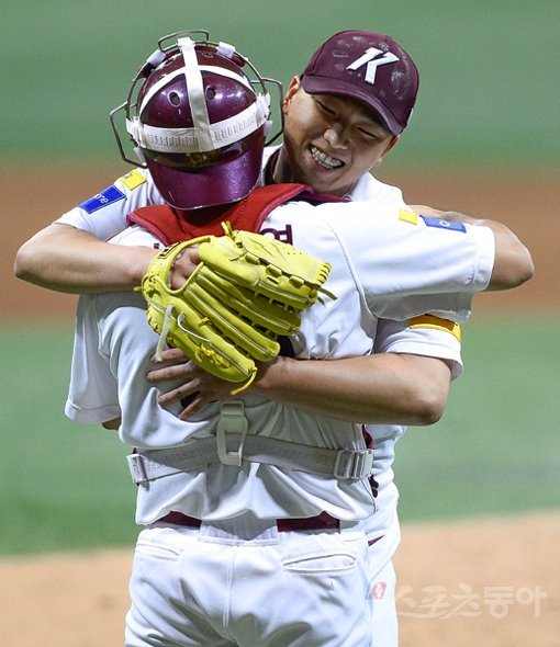 지난달 8일 서울 고척스카이돔에서 열린 LG 트윈스와 키움 히어로즈의 경기에서 키움 선발 이승호가 완봉승을 작성한 후 포수 이지영과 포옹을 하고 있는 모습. 스포츠동아DB