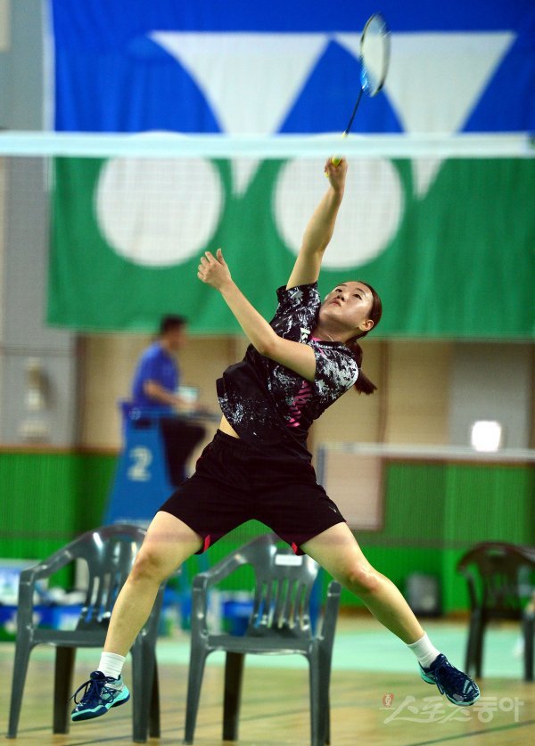 한국국제대학교 신재은과 부산외국어대학교 정현지의 여자 대학부 단식 16강 경기에서 신재은이 공격을 펼치고 있다.