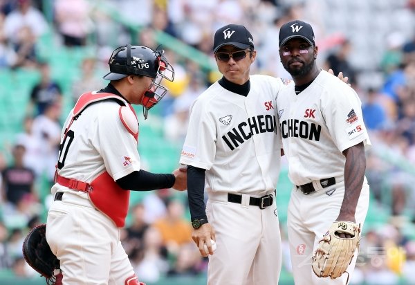 1일 인천 SK행복드림구장에서 ‘2019 신한은행 MY CAR KBO리그’ SK 와이번스와 LG 트윈스의 경기가 열렸다. 3회초 2사 1루에서 SK 선발 소사가 교체되고 있다.