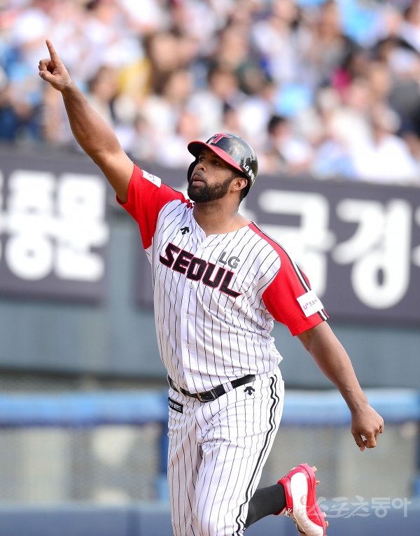 15일 서울잠실야구장에서 ‘2019 신한은행 MY CAR KBO리그’ 두산 베어스와 LG 트윈스 경기가 열렸다. 4회말 2사 1루 LG 페게로가 우중월 솔로 홈런을 날린 후 그라운드를 돌아 홈인하며 세리머니를 하고 있다.