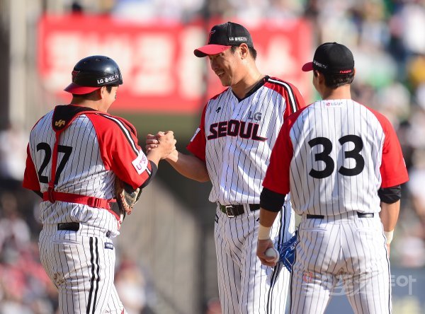 경기 후 은퇴식을 갖는 LG 이동현이 7회초 등판해 두산 박세혁을 삼진 아웃 시킨 후 교체되며 유강남과 악수하고 있다.