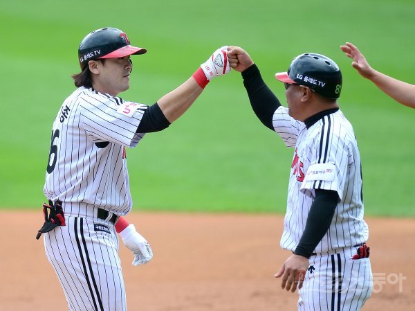 3일 서울 잠실야구장에서 ‘2019 신한은행 MY CAR KBO 포스트시즌’ LG 트윈스와 NC 다이노스의 와일드카드 결정전 1차전이 열렸다. 1회말 1사 2루 LG 이형종이 1타점 적시타를 치고 1루에서 하이파이브 하고 있다.