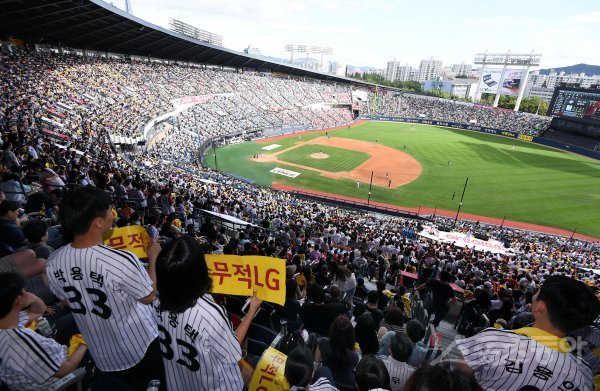 3일 서울 잠실야구장에서 ‘2019 신한은행 MY CAR KBO리그’ LG 트윈스와 NC 다이노스의 와일드카드 1차전 경기가 열렸다. 많은 야구팬들이 잠실야구장을 찾아 응원을 펼치고 있다.