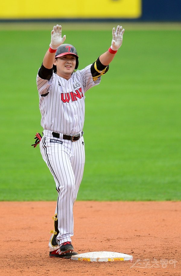 3일 서울 잠실야구장에서 ‘2019 신한은행 MY CAR KBO 포스트시즌’ LG 트윈스와 NC 다이노스의 와일드카드 결정전 1차전이 열렸다. 4회말 1사 2루 LG 이형종이 1타점 좌전 2루타를 치고 2루에서 기뻐하고 있다.