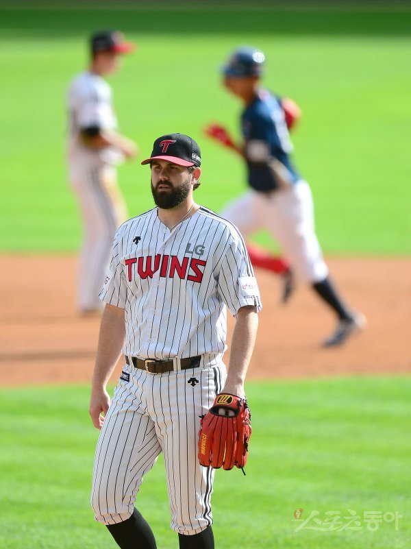 3일 서울 잠실야구장에서 ‘2019 신한은행 MY CAR KBO 포스트시즌’ LG 트윈스와 NC 다이노스의 와일드카드 결정전 1차전이 열렸다. 선발 투수로 등판한 LG 켈리가 5회초 1사 NC 노진혁에게 우월 솔로 홈런을 허용한 후 아쉬워하고 있다.