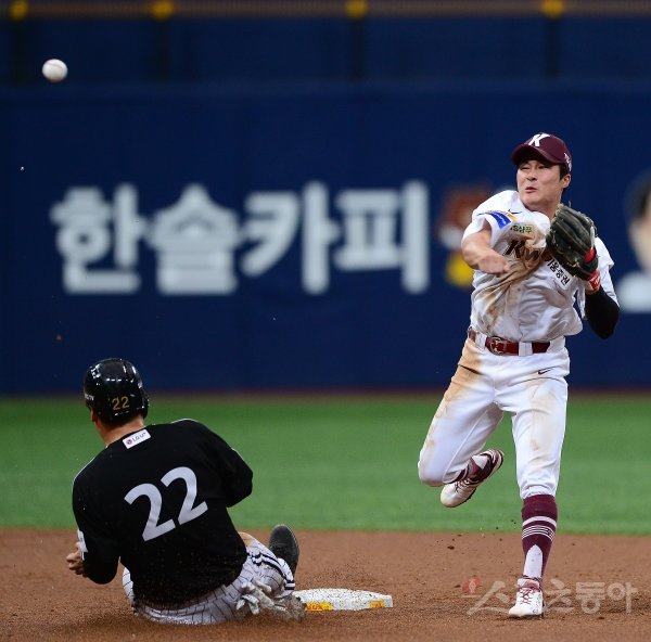 6일 서울 고척스카이돔에서 ‘2019 신한은행 MY CAR KBO 포스트시즌’ LG 트윈스와 키움 히어로즈의 경기가 열렸다. 키움 유격수 김하성이 2회초 1사 1루에서 LG의 2루수 앞 땅볼 때 2루로 향하는 김현수를 포스아웃 시킨 후 1루로 송구하고 있다.