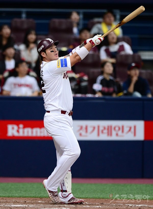 6일 서울 고척스카이돔에서 ‘2019 신한은행 MY CAR KBO 포스트시즌’ LG 트윈스와 키움 히어로즈의 경기가 열렸다. 키움 박병호가 4회말 선두타자로 나와 큼지막한 타구를 친 뒤 응시하고 있다. 결과는 외야 플라이 아웃.