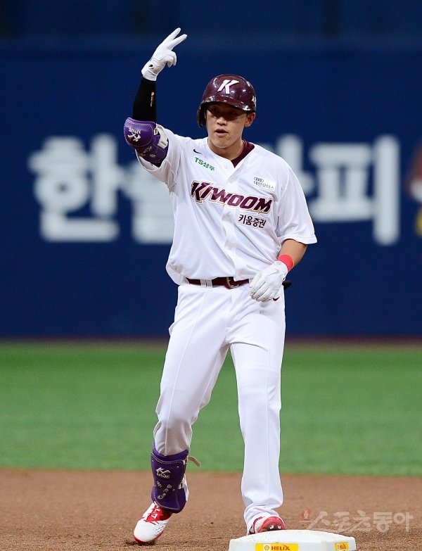 6일 서울 고척스카이돔에서 ‘2019 신한은행 MY CAR KBO 포스트시즌’ LG 트윈스와 키움 히어로즈의 경기가 열렸다. 키움 김웅빈이 4회말 1사 1루에서 2루타를 친 후 세리머니를 하고 있다.