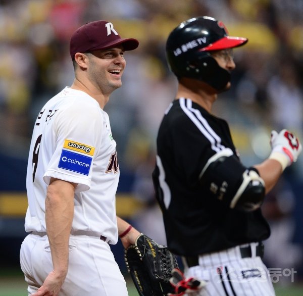 6일 서울 고척스카이돔에서 ‘2019 신한은행 MY CAR KBO 포스트시즌’ LG 트윈스와 키움 히어로즈의 경기가 열렸다. 키움 선발 브리검이 7회초 LG 박용택에게 안타를 허용한 후 미소를 짓고 있다.