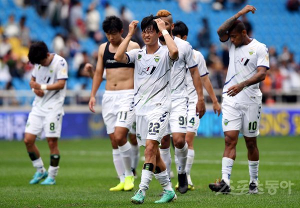 6일 인천 축구전용경기장에서 열린 ‘하나원큐 K리그1 2019’ 인천 유나이티드와 전북 현대의 경기에서 전북과 인천이 0-0 무승부를 기록한 뒤 전북 선수들이 아쉬워하고 있다.