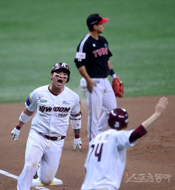 6일 서울 고척스카이돔에서 ‘2019 신한은행 MY CAR KBO 포스트시즌’ LG 트윈스와 키움 히어로즈의 준플레이오프 1차전이 열렸다. 9회말 무사 키움 박병호가 끝내기 중월 솔로 홈런을 날리고 그라운드를 돌며 환호하고 있다.