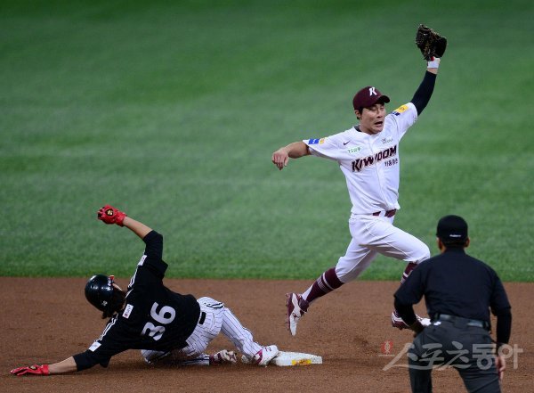 7일 서울 고척스카이돔에서 ‘2019 신한은행 MY CAR KBO 포스트시즌’ LG 트윈스와 키움 히어로즈의 준플레이오프 2차전이 열렸다. 1회초 1사 1,2루 LG 채은성 1루수 직선타 아웃 때 키움 김하성이 송구된 볼을 잡아 2루주자를 아웃시키고 있다.