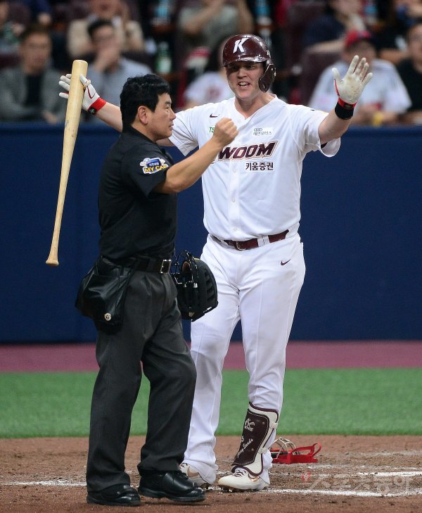 7일 서울 고척스카이돔에서 ‘2019 신한은행 MY CAR KBO 포스트시즌’ LG 트윈스와 키움 히어로즈의 경기가 열렸다. 키움 샌즈가 6회말 무사 1,3루에서 포수 앞 땅볼로 아웃 판정을 받자 강하게 어필하고 있다.