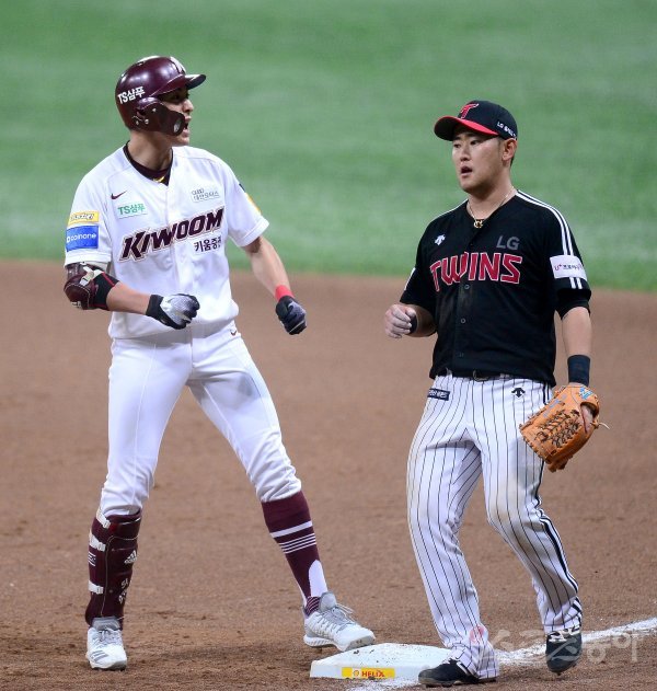 7일 서울 고척스카이돔에서 ‘2019 신한은행 MY CAR KBO 포스트시즌’ LG 트윈스와 키움 히어로즈의 준플레이오프 2차전이 열렸다. 6회말 무사 2,3루 키움 이정후가 1타점 적시타를 치고 1루에서 환호하고 있다.