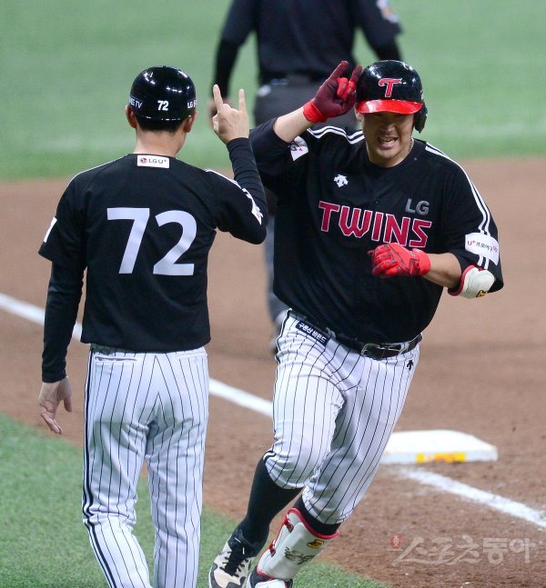 7일 서울 고척스카이돔에서 ‘2019 신한은행 MY CAR KBO 포스트시즌’ LG 트윈스와 키움 히어로즈의 준플레이오프 2차전이 열렸다. 7회초 2사 LG 유강남이 좌월 솔로 홈런을 날리고 그라운드를 돌며 환호하고 있다.