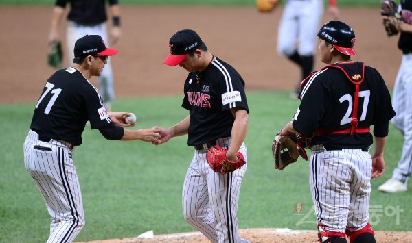7일 서울 고척스카이돔에서 ‘2019 신한은행 MY CAR KBO 포스트시즌’ LG 트윈스와 키움 히어로즈의 준플레이오프 2차전이 열렸다. 9회말 2사 만루 상황에서 LG 고우석이 강판되고 있다.