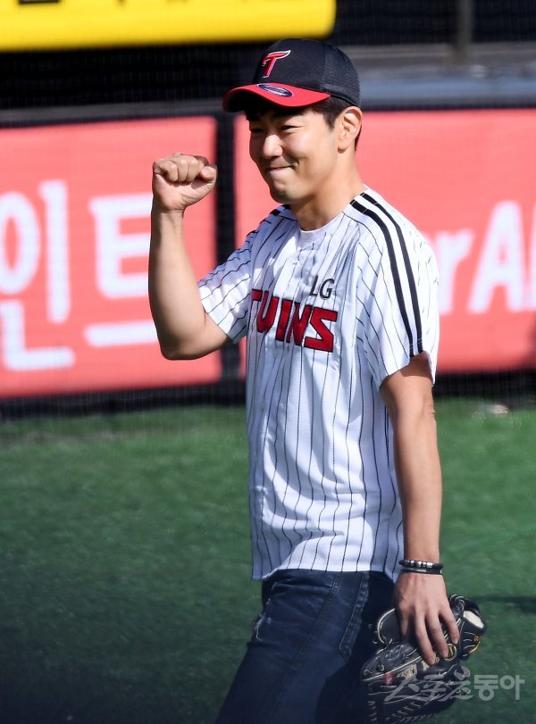 9일 서울 잠실야구장에서 ‘2019 신한은행 MY CAR KBO리그’ LG 트윈스와 키움 히어로즈의 준PO 3차전 경기가 열렸다. 시구자로 나선 배우 이종혁이 시구를 마친 뒤 LG 선수들을 향해 화이팅을 외치고 있다.