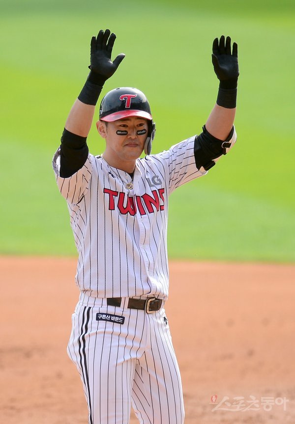 9일 서울 잠실야구장에서 ‘2019 신한은행 MY CAR KBO 포스트시즌’ 키움 히어로즈와 LG 트윈스의 준플레이오프 3차전이 열렸다. 2회말 2사 1,2루 LG 정주현이 1타점 적시타를 치고 1루에서 기뻐하고 있다.