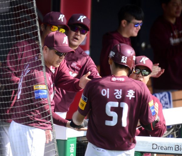 9일 서울 잠실야구장에서 ‘2019 신한은행 MY CAR KBO 포스트시즌’ 키움 히어로즈와 LG 트윈스의 준플레이오프 3차전이 열렸다. 1회초 2사 2루 키움 박병호의 선제 1타점 적시타 때 득점한 이정후가 장정석 감독과 더그아웃에서 하이파이브 하고 있다.