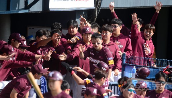 9일 서울 잠실야구장에서 ‘2019 신한은행 MY CAR KBO 포스트시즌’ 키움 히어로즈와 LG 트윈스의 준플레이오프 3차전이 열렸다. 1회초 2사 2루 키움 박병호의 선제 1타점 적시타 때 득점한 이정후가 더그아웃에서 하이파이브 하고 있다.
