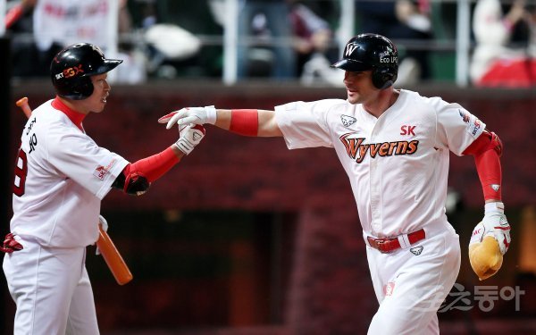 2회말 무사에서 SK 로맥이 좌월 솔로 홈런을 날린 뒤 고종욱의 환영을 받고 있다.