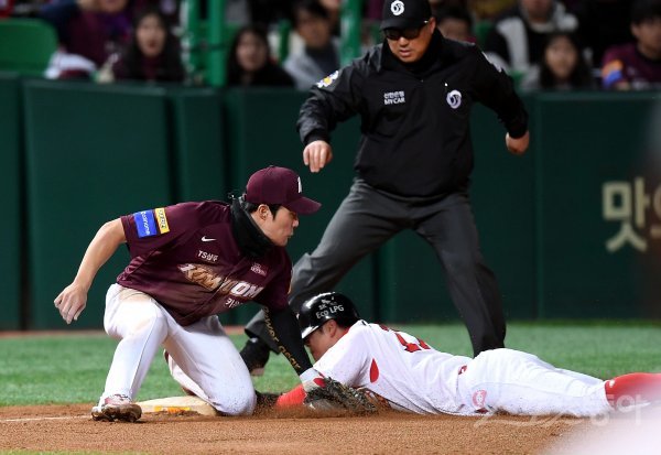 3회말 1사 1루에서 SK 김강민의 내야 땅볼 때 1루 주자 노수광이 3루까지 달려 세이프 되고 있다.