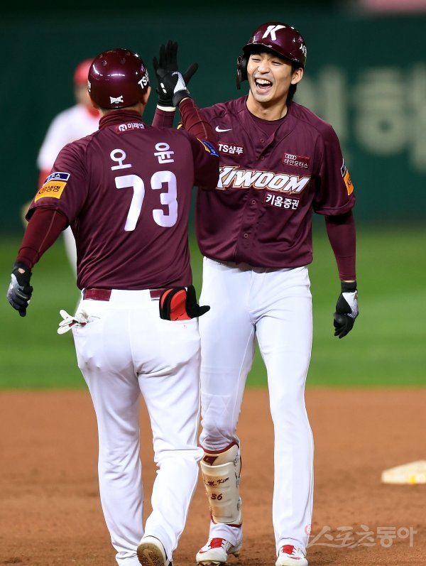 4회초 2사 2, 3루에서 키움 김규민이 2타점 동점 2루타를 날린 뒤 오윤 코치와 기쁨을 나누고 있다.