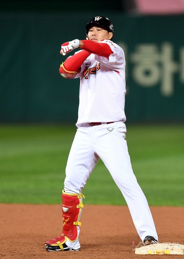 5회말 무사 1, 2루에서 SK 노수광의 희생번트 때 2루 2사 1, 2루에서 SK 한동민이 2타점 2루타를 날린 뒤 세리머니를 펼치고 있다.