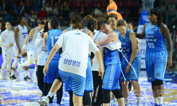 21일 경기도 용인실내체육관에서 열린 ‘하나원큐 2019-2020 여자프로농구’ 우리은행과 삼성생명 경기에서 68-62 승리를 거둔 삼성생명 선수들이 기뻐하고 있다.
