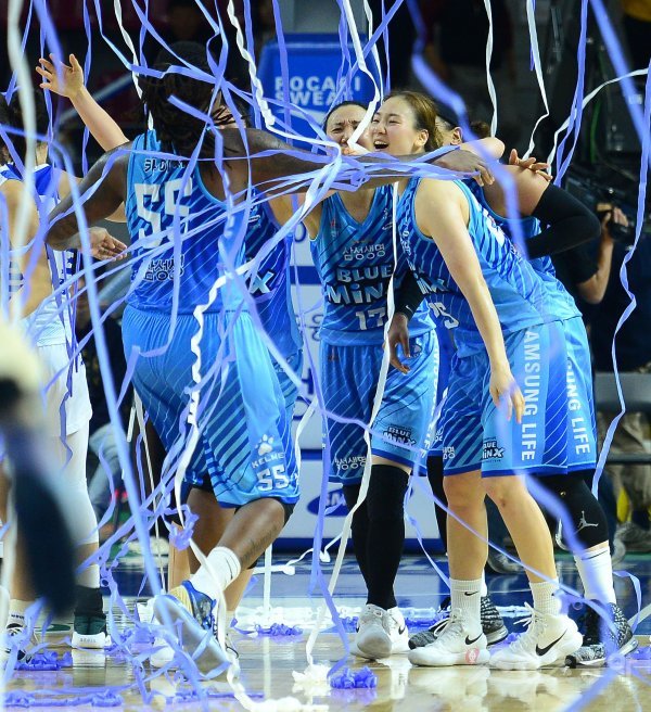 21일 경기도 용인실내체육관에서 열린 ‘하나원큐 2019-2020 여자프로농구’ 우리은행과 삼성생명 경기에서 68-62 승리를 거둔 삼성생명 선수들이 기뻐하고 있다.