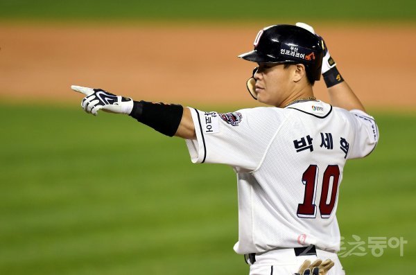 2회말 1사 만루에서 두산 박세혁이 1타점 역전 적시타를 날린 뒤 환호하고 있다.