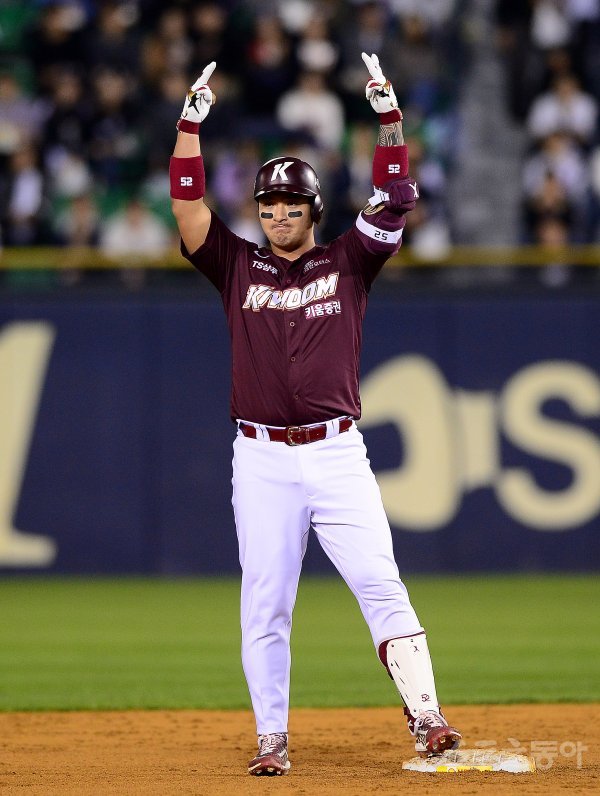 키움 박병호가 4회초 무사 1루에서 2루타를 친 후 덕아웃을 향해 세리머니를 하고 있다.