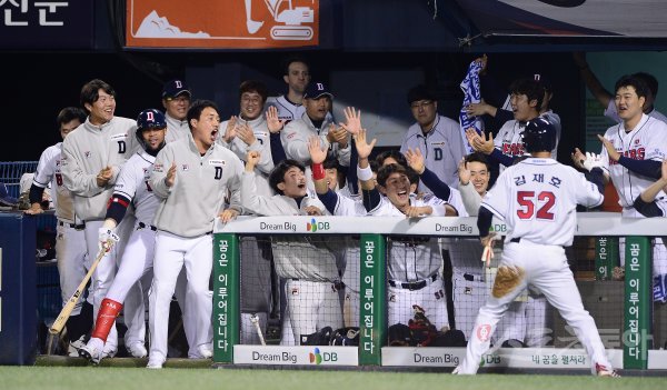 두산 덕아웃 선수들이 4회말 2사 2루에서 후속 타자의 내야 땅볼 때 상대의 실책으로 홈까지 쇄도, 득점에 성공한 김재호를 보며 환호하고 있다.