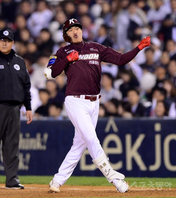 키움 송성문이 대타로 나와 7회초 2사 2루에서 동점 적시타를 친 후 덕아웃을 향해 세리머니를 하고 있다.