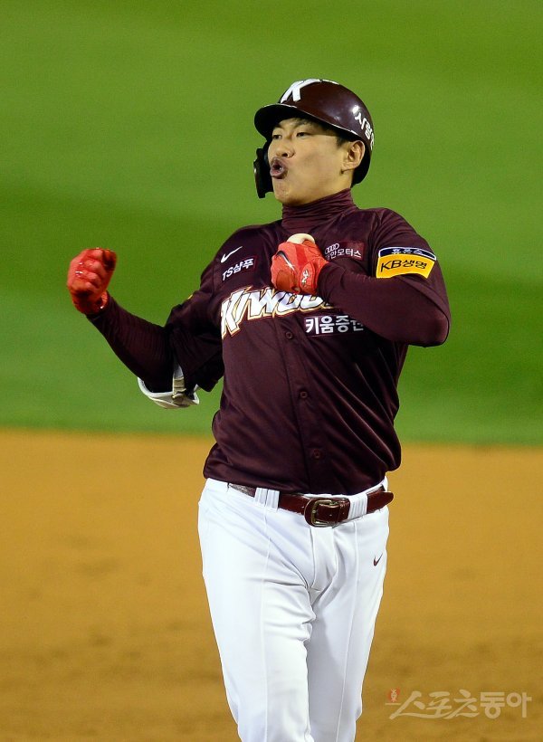 7회초 2사 2루 키움 송성문이 동점 적시타를 치고 1루에서 환호하고 있다.