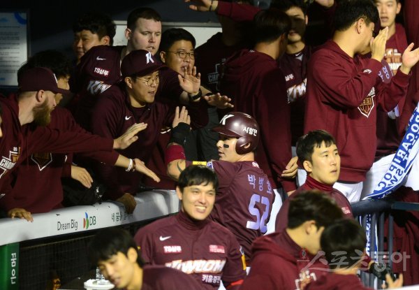 6회초 1사 1,2루 키움 송성문의 1타점 적시타 때 득점한 박병호가 더그아웃에서 하이파이브하고 있다.