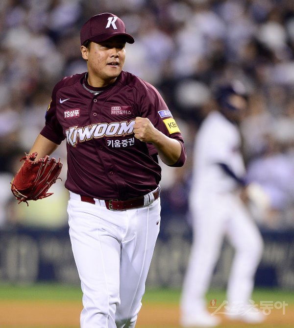 키움 이영준이 8회말 2사 1,3루에서 상대 타자를 삼진으로 잡아낸 후 환호하고 있다.