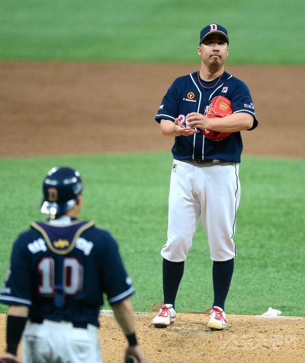 26일 서울 고척스카이돔에서 ‘2019 신한은행 MY CAR KBO 포스트시즌’ 두산 베어스와 키움 히어로즈의 한국시리즈 4차전이 열렸다. 선발 투수로 등판한 두산 유희관이 2회말 무사 1,3루 상황에서 강판되고 있다.